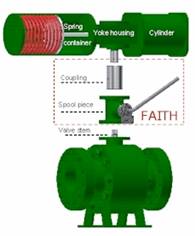 執(zhí)行器通過旋轉(zhuǎn)連接件與閥門連接。連接件的底部于閥桿連接,頂部與執(zhí)行器的驅(qū)動(dòng)頭連接。 支座安裝在閥門法蘭上以制成執(zhí)行器。 緊急情況下,彈簧儲(chǔ)存的能量推動(dòng)閥門到關(guān)閉位置。 通過替換原有的制作和連接件,F(xiàn)AITH系統(tǒng)集成到新的制作和連接件中。在測(cè)試中,F(xiàn)AITH系統(tǒng)只允許旋轉(zhuǎn)的連接件做一定角度的轉(zhuǎn)動(dòng),如20度(也可選其他角度)。